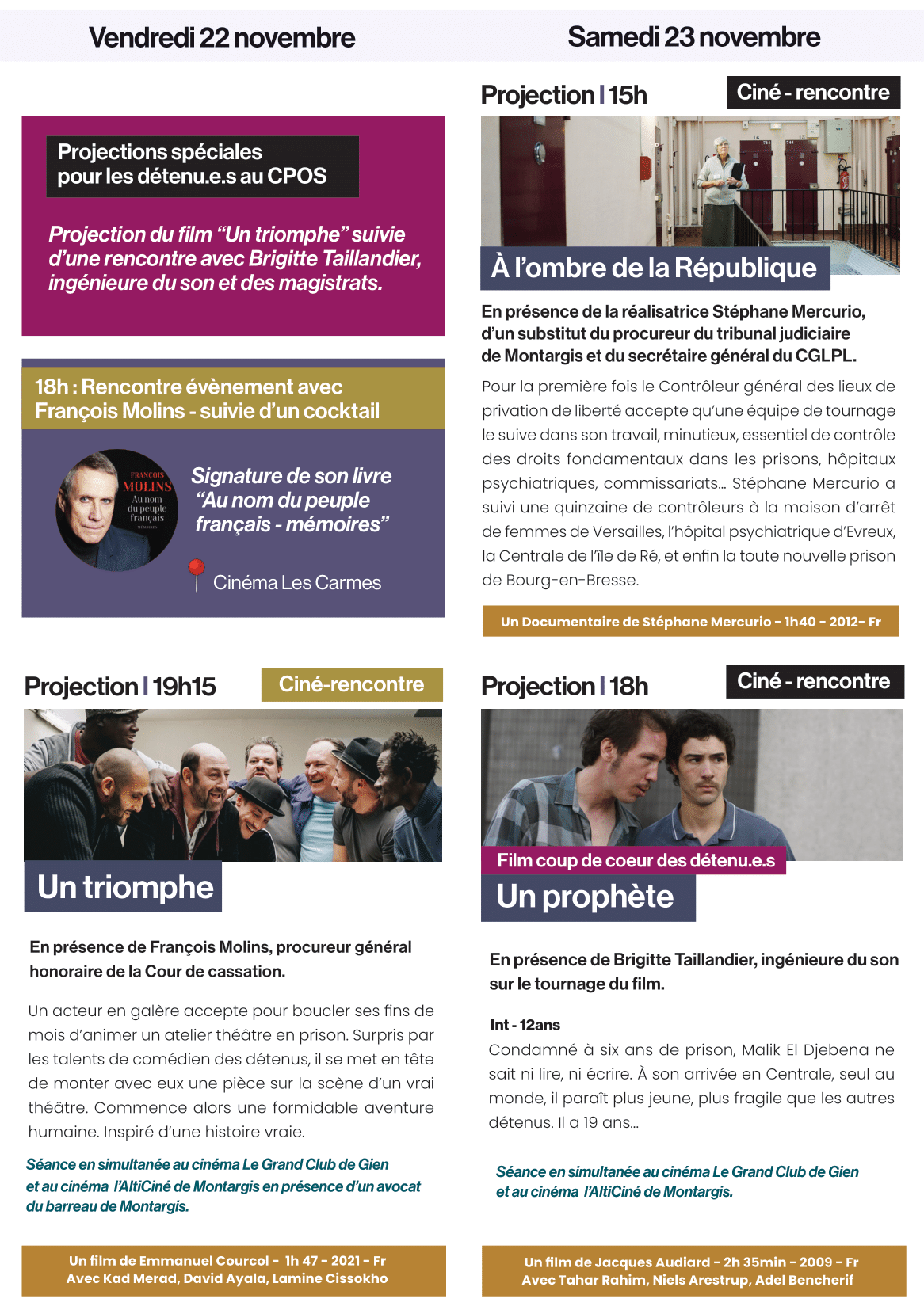 ? De multiples projections de films seront proposées sur des œuvres tel que « Borgo »,  » à l’ombre de la république », « un prophète » et « le trou ».
